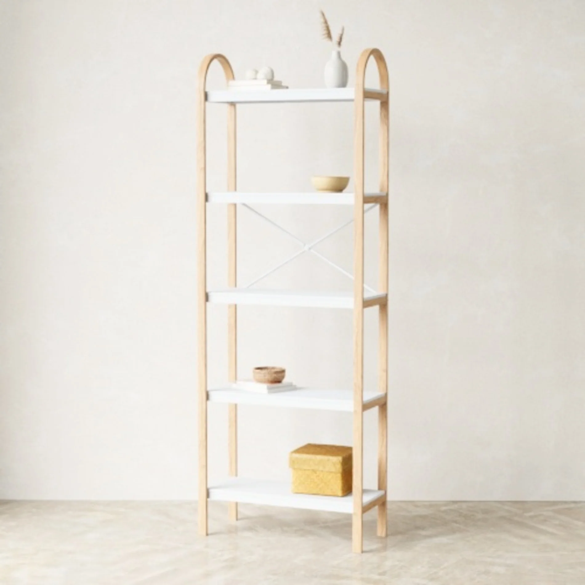Both decorative and versatile, Bellwood Freestand Shelf can be used in a variety of rooms to showcase decor and/or store your items. Easy to assemble, Bellwood features real wood accents and integrated handles, making it easy to move around. Each shelf holds 29lbs (13 kg). Part of Umbra's Bellwood Family that includes a matching coffee table, side table, umbrella stand, over the toilet shelf, wall shelf and more. Includes a furniture safety strap that can be screwed into the wall. Measures 10.15 x 24 x 66.77 inches (26 x 61 x 170 cm). Sourced from renewable wood sources. Wood is a unique natural material with variations in tone, texture, and grain. The product may vary from our imagery. ⓘ For Best Care: use coasters to avoid direct contact to wood surfaces and if you experience a spill, wipe with a damp clean cloth immediately to avoid discoloration.